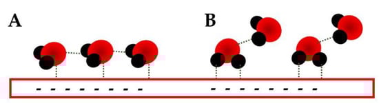 Representation of the two H-down conformation described by Li et al. [11] at potentials more negative than PZC; (A) is expected for shortly more negative than the PZC and (B) for potentials much more negative.