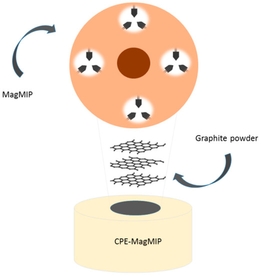 The proposed sensor based on carbon paste consists of 27 mg of graphite powder, 3.0 mg of magnetic molecularly imprinted polymer (synthesized according to the work of our research group) [28], and 8.0 μL of mineral oil (optimized conditions), Figure 1.