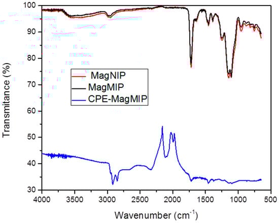 FT-IR spectrum of the MagNIP, MagMIP, and CPE-MagMIP.