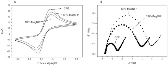 Electrochemical characterization in KCl 0.1 M containing 5 mM K3[Fe (CN)6]/K4[Fe (CN)6]: (A) CV voltammograms and (B) Nyquist plots; electrodes: CPE; CPE-MagMIP, and CPE-MagNIP.