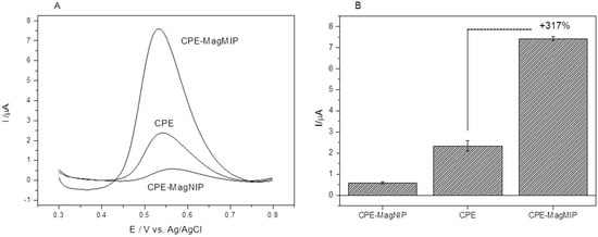 The evaluation of the working electrode configuration shows the influence of the MagMIP on the sensor to determine the E2 (Figure 4a). E2 oxidation occurred at a potential above +0.54 V. The carbon paste electrode (bare electrode) showed a low current intensity. On the other hand, the successful modification with MagMIP is evidenced by the increase in anodic peak current. The electrode modified with MagMIP showed a 317% increase in current intensity relative to the unmodified electrode (Figure 4b). This increase is attributed to the interaction of E2 with MagMIP. The advantage of employing a magnetic MIP is that the impression sites are more available on the surface of the material, which improves the ability to recognize the target molecule [26]. In addition, a control experiment carried out using MagNIP, demonstrates a low affinity of E2 on the electrode surface due to the non-selective characteristics of this material [37].