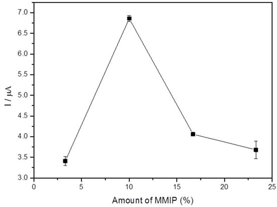 Different amounts of MagMIP were used in the construction of the carbon paste electrode to evaluate the influence of the amount of modifier material on the sensor response (Figure 5). The configuration of the working electrode with 10% of MagMIP showed the best response in the oxidation of E2. For percentages of 16.7 and 23.3% of MagMIP, the analytical signal decreased. Higher amounts of MagMIP, while contributing to more imprint sites, may increase resistance to electron transfer.
