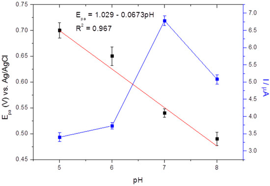 Figure 6 also shows a linear relationship between Epa and pH value: Epa (V) = 1.029 − 0.0673 pH (R2 = 0.967). The slope of the equation is 0.0673 V pH−1, an approximate value of the Nernstian value of 0.059 V pH−1. Thus, the number of protons is equal to the number of electrons in the electro-oxidation of E2 on the CPE-MagMIP. Other works report the same conclusion [14,39].