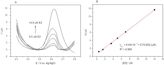 The CPE-MagMIP was quantitatively analyzed as the E2 concentration was increased from a stock solution of 1 mM. Figure 9A shows the voltammograms obtained for the successive additions. The analytical curve obtained for the proposed sensor is represented in Figure 9B and displayed a linear response range from 0.5 to 14.0 μM, and a sensitivity of 0.79 μA L μmol−1 (R2 = 0.998). Above 14.0 μM, the analytical signal increases non-linearly, which suggests a saturation of the E2 adsorption process on the electrode surface. The detection limit (LOD) and quantification limit (LOQ) were equal to 0.13 and 0.44 μM, respectively, calculated from the parameters of the analytical curve obtained under optimized conditions [42].