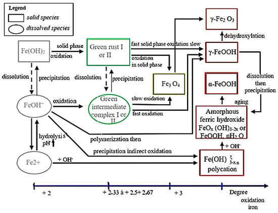 Based on these reactions, Misawa et al. and Cornell and Schwertmann [21,22] conducted studies on the formation of compounds resulting from oxidation. These studies established a relatively complex reaction scheme that governs the appearance and evolution of species in aqueous solution, starting from the formation of ferrous ions (Fe2+) (Figure 2):