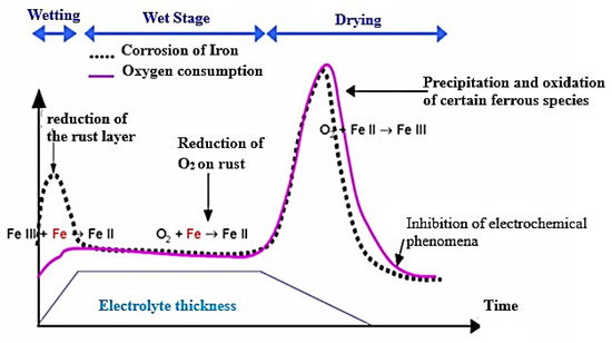 The corrosion product layer itself is responsible for the corrosion, and the anodic dissolution of the metal is balanced by the reduction of a constituent of this layer [28]. Research by Matsushima [15] showed that the reaction of ferric species is dominant in the cathodic reaction on corroded iron in wet corrosion. This finding was later confirmed by Evans and Taylor [25], and Stratmann, [29], further solidifying the importance of the wetting phase in atmospheric corrosion and the role of the corrosion product layer in the electrochemical reactions taking place. This work highlights the complex and multi-faceted nature of atmospheric corrosion and the need for a comprehensive understanding of the various processes involved to effectively prevent and mitigate the effects of corrosion in metal materials.