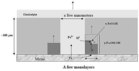 - Corrosion areas where the ions resulting from the dissolution of iron either in acidic media (Fe2+ and Fe3+) or in very basic media (HFeO2−) are responsible for the corrosion.