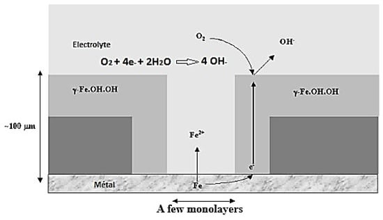 During the humidification–drying cycle, the formation of an electrolyte film on the metal surface triggers the anodic dissolution of iron, and the electrons produced by the oxidation reaction must be consumed by a reduction reaction. During the wetting phase (Figure 5), a strong dissolution kinetics of iron is observed due to the fact that the rust layer formed is not conductive and therefore oxygen cannot reduce on its surface. This leads to a reduction of the metal surface accessible through a network of tortuous and nanometric pores, which contributes to the overall corrosion process. This highlights the importance of the wetting stage in atmospheric corrosion and the complex interplay between electrochemical reactions, the thickness of the electrolyte film, and the physical and chemical conditions of the environment [3].