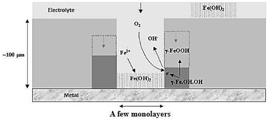 Diagram of the atmospheric corrosion process at the surface with the reaction balance involved.