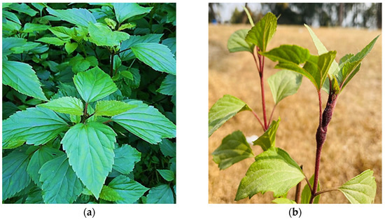 The Ageratina adenophora Spreng. (synonym Eupatorium adenophorum) plant is a major conspicuous, invasive, prevalent, and alien species known to be of Mexican origin and belonging to the Asteraceae plant family (Figure 1). The plant possesses high adaptability and reproducibility in the invaded environment by modifying the microbial communities in the soil, which has the potential to affect the soil, plants and biodiversity of the area [26,27]. According to the review of the literature on phytochemical [28], phytotoxicity [29], invasive nature, biological control [30] and pharmacological [31] studies, the Ageratina plant has been a prolific producer of numerous primary and secondary bioactive phytochemicals, making it beneficial for antibacterial, anti-inflammatory, antioxidant, and pharmacological purposes. Additionally, this plant has historically been utilized by traditional medicine practitioners for curing various ailments.