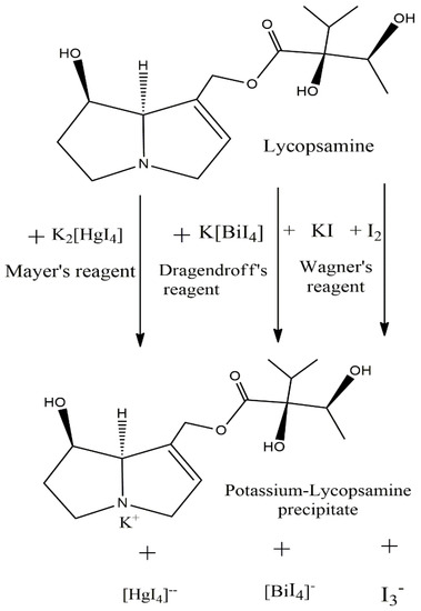 The colored precipitate is due to the formation of complexes between the several alkaloid molecules with the respective chemical reagents. The chemical reactions involved in the phytochemical screening of alkaloids can be simplified and illustrated by considering the lycopsamine compound as a reference alkaloid, as seen in Figure 3. The precipitate formation is due to the formation of potassium salt of alkaloid [23,25,37], and the color development is due to charge transfer/electron transfer reaction within the salt [38,39].