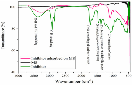 FTIR spectra in the 4000–450 cm−1 frequency range of MS, inhibitor molecules, and MS immersed in a 600 ppm inhibitor solution for 1 h immersion.