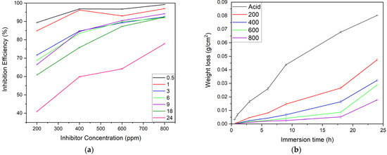 The corrosion inhibition efficiency of the alkaloid is a concentration-dependent parameter [19,25]. The observation showed the accelerated inhibiting performance of the inhibitor’s concentrations in a series of 200 ppm < 400 ppm < 600 ppm < 800 ppm, as depicted in Figure 6a. The highest inhibiting performance was shown by the 800 ppm (96.95% IE) inhibitor solution due to the abundance of alkaloid molecules which almost completely covered the MS surface for a 1 h immersion period during which the lowest inhibition was seen for the 200 ppm (84.93% IE) inhibitor solution. The longest immersion period during which substantial efficiency (above 70% IE) was seen was 18 h, except for the 200 ppm inhibitor solution. However, after 24 h, the inhibitory performance of the 800 ppm inhibitor concentration declined to 77.88%, and the 200 ppm inhibitor concentration to 40.89%. This is because there are fewer inhibitor molecules to cover the MS substrate, allowing the acid’s corrosive attack to happen [23].