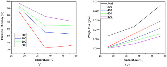 The effect of temperature on the inhibitor solutions’ inhibitory action depends on the molecular vibration, structure, and concentrations of the alkaloids [7]. In this experiment the rise in temperature from 28–48 °C also showed a variation in the weight loss and inhibition efficiency for the MS samples in both acid and inhibitor solutions, as depicted in Figure 7a,b. Here, the sample in inhibitor solution shows implicit weight loss at room temperature 28 °C. At 38 °C, the weight loss of MS dipped separately in acid solution, and in the 200 ppm inhibitor solution this was almost the same. This may be due to the rapid desorption of inhibitor molecules from the substrate. The sample in the 800 ppm inhibitor solution showed minimal weight loss, and other inhibitors (i.e., 400 and 600 ppm) showed relatively moderate weight loss. As shown in Figure 7a, more pronounced nonlinearity in the efficiency of 200 ppm and less in 800 ppm of inhibitor were observed, but, from 38–48 °C, linearity was observed for samples in the 400, 600, and 800 ppm inhibitor concentrations. Furthermore, the observation showed a 20–50% decrease in inhibition efficiency from 28–38 °C; afterward, only a 1–8% decrease was seen. This indicates that the suitable temperatures for the formation of the inhibitor layer are 28 and 48°C.