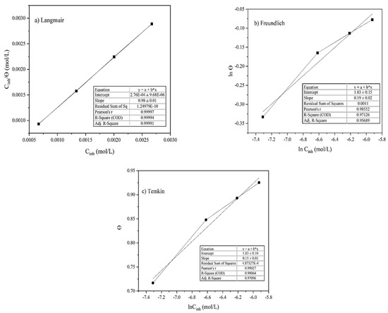 Similarly, the corrosion inhibition mechanism, the interaction nature, and the adsorption processes’ spontaneity were studied from the Temkin and Freundlich adsorption isotherm models employing Equations (6) and (7). The fitting of the Freundlich isotherm plot of ln θ versus ln Cinh yielded a slope of a straight line with an R2 coefficient value in the merely acceptable range (0.971) and a slope (1/n) equal to 0.185 as illustrated in Figure 8b. As the value of 1/n lies between 0 and 1, this verified a spontaneous adsorption process [17].