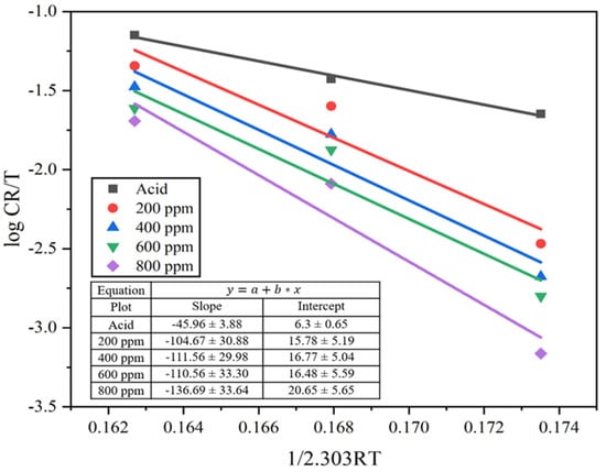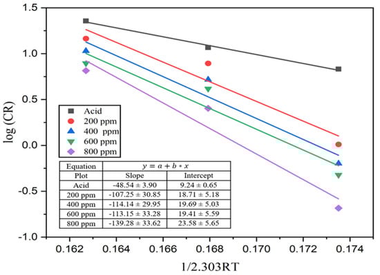 The corrosion kinetic and thermodynamic activation parameters were elucidated by considering the data obtained from the weight loss measurements at different temperatures. The corrosion rate (CR) was calculated using Equation (8),