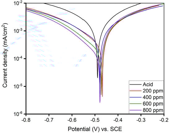 The pretreated MS sample with the acid and corresponding inhibitor solutions (200, 400, 600, and 800 ppm) were placed in an electrochemical setup to record the one-hour immersed polarization curves in the potential window of −0.8 to −0.2 V on the Gamry Framework instrument at 293 K. Triplicate measurements were performed for the reproducibility issue. Figure 11 shows the anodic and cathodic Tafel polarization curves of one-hour-immersed MS sample in acid and different concentrations of inhibitor solution, from which electrochemical parameters such as current density, corrosion potential, anodic slope, cathodic slope, and inhibition efficiency are recorded by the extrapolation method and placed in Table 4. The rapid physical adsorption and desorption of the inhibitor molecules on the MS surface after its exposure to acid and inhibitor media showed a decrement in the corrosion current density (Icorr) [7,17] with the increment in the inhibitor concentrations.