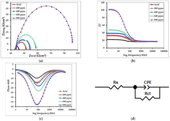 Representing (a) Nyquist (Cole-Cole) plot, (b) Bode plots, and (c) Bode plots of phase shift versus log frequency for the MS in 1 M H2SO4 without and with inhibitors of different concentrations, and (d) the equivalent circuit model used to fit the impedance spectra.
