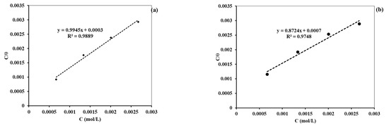 The adsorption isotherms were also fitted from the data obtained by the PDP and EIS measurement methods. The best fitted data were for the Langmuir adsorption isotherm. The R2 values for both cases are nearly equal to unity, indicating that the adsorption followed the Langmuir adsorption isotherm. This finding is similar to the isotherm fitted from weight loss data. Figure 13a,b presents the Langmuir adsorption isotherm fitted from the PDP and EIS data, respectively.