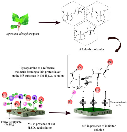 Schematic diagram showing the mechanism of corrosion inhibition by alkaloid molecules in reference to lycopsamine molecule.