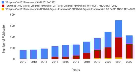 Bibliometric analysis is a rigorous and well-established methodology for examining and analyzing scientific data on a large scale []. This approach helps researchers understand the changing characteristics of a particular field while also revealing information about emerging areas of research. Although bibliometric analysis is widely used in scientific research, its use in business research is relatively new and often does not reach its full potential due to limited datasets []. Advanced bibliometric reviews can be challenging to conduct because they often rely on a limited set of data, resulting in an incomplete understanding of the area under study [,]. In addition, reviews conducted within a given period may not comprehensively capture all scientific advances []. In this review, a bibliometric search was conducted using specific parameters on the Web of Science—Core Collection website. The databases used in this work were selected using an information-adding methodology, in which new search terms were added to each database to estimate the volume of publications in the field. The bibliometric search shows the number of publications related to MOFs, enzymes, and biosensors by year in the collected databases, highlighting the large number of articles published between 2012 and 2022. Although the difference in the number of publications is noticeable, a numerical trend was observed in the three databases studied, demonstrating the interest of researchers in this field, especially in 2020 and 2021. The relationship between the two largest databases showed a division of knowledge between enzymes for biosensor development and MOFs for their multiple applications. The smaller database served to correlate the other databases, allowing for a more in-depth study of biosensor development using the enzyme-MOF set. The third database was smaller than the others, indicating that the specific research area covered by this paper had little literary repertoire. To gain a comprehensive view of the topic, a systematic analysis of the database represented by the color red was used, as it contained articles from the smallest database, allowing for an in-depth understanding of the topic. Overall, bibliometric analysis is a valuable tool for exploring scientific data on a large scale and can provide insights into the evolving characteristics of a particular field.