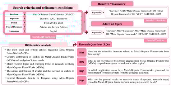 This paper provides an in-depth bibliometric analysis of recent advances and prospects in the design of biosensors and MOF@Enzyme materials. The primary objective is to demonstrate the evolution of research in this field over the last decade, Figure 1. The collected data will be thoroughly analyzed to identify emerging patterns, overarching themes, new subfields of study, significant keywords, and collaborative networks. The data were carefully selected based on relevance and addressed the following research questions (RQs):