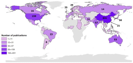 The VOSviewer software was developed by the Center for the Study of Science and Technology (CWTS) at Leiden University in the Netherlands. The CiteSpace software was developed by Dr. Chaomei Chen at Drexel University in the United States. CiteSpace is part of a suite of products developed by the Environmental Systems Research Institute (Esri) in Redlands, California, USA. ArcGIS 10.5 software was used to analyze the geographic distribution of publications, and VOSviewer [] was used for data visualization. In addition, CiteSpace was used to identify and predict potential future research subfields in a given field using keywords and clusters [].