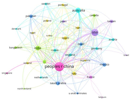 Network visualization map related to the collaboration between countries with at least five published papers. The thickness of the lines connecting the two countries strongly indicates the accumulation of co-authorship, and the colors divided into clusters demonstrate the countries with high collaboration in each cluster.