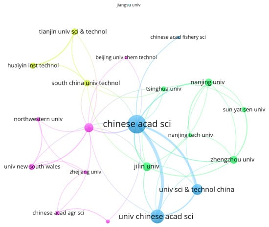 To gain a better understanding of the distribution of the articles analyzed, it is crucial to examine the organizations associated with them. It was possible to identify 118 institutions with five or more publications in the database, the most prominent of which was the Chinese Academy of Sciences, which received 5389 citations and produced 68 documents. An important detail from this analysis is that the 10 most productive organizations were Chinese, which is reflected in the number of articles published by the country (accounting for more than 50% of the documents), and they also collectively gathered a large number of citations (17,132 citations). In addition, Figure 5 shows the co-authorship relationships in the publications, reinforcing an important aspect: institutions benefit from each other by collaborating in the construction of other articles and taking credit through citations.