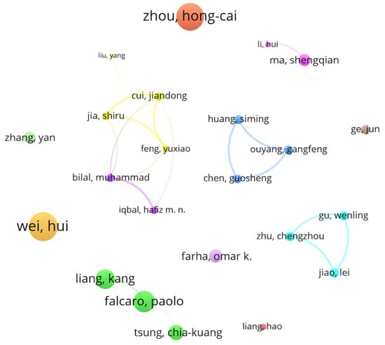 In this analysis, the authors who published articles in the field of study were considered as an evaluation criterion. The collected database contained a total of 5760 different authors, indicating great interest in the research area studied. However, after modifying the criteria to create the map in VOSviewer (which shows the authors according to their participation in publications), it was found that 4724 authors participated in the production of only one publication, which represents approximately 82% of the authors. To understand the authors most involved in the field and the relationships of collaboration between them, a visualization map of the collaboration between authors with at least 10 scientific publications bearing their names was created (Figure 7). There are two possible classifications to define the importance of the authors: by the number of publications or by the number of citations. Since the scientific quality of the authors must be taken into account, the number of citations is a more efficient aspect to consider. This is because the number of times an author has been cited indicates the interest of other researchers in searching for the content developed by the author in question. The quantity of articles in which an author is involved does not necessarily reflect their scientific support or the quality of the information they have developed. Accordingly, the authors Wei and Zhou led the ranking of authors with the highest number of citations (3627 and 3412 citations, respectively) in the database. An interesting feature of these two authors, as shown in Figure 7, is that there were no links connecting them among the most influential authors, indicating individual work or work with specific research groups. Wei participated in the development of the most cited article entitled “Nanomaterials with enzyme-like characteristics (nanozymes): next-generation artificial enzymes (II)” [], which received 1651 citations, accounting for about 46% of the author’s total citations. In addition, Figure 7 shows a significant research characteristic: the dispersion of small groups of researchers, which reveals a non-concentrated research interest.