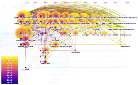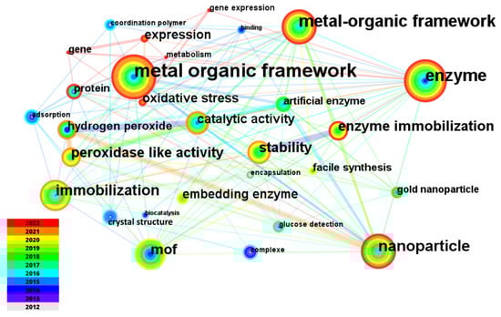 By analyzing the keywords present in the database using the data processing tools CiteSpace (Figure 8) we can gain insights into the general characteristics of the topic addressed in the articles. The database contained 2969 author keywords, and the classification of the terms with the highest frequency revealed some trends such as the processes in which MOFs are more involved and the relevance of biosensors in this environment. The keyword “metal-organic frameworks” was the most cited term (430) and is highlighted in Table 4 as a general term of research. However, many terms in this table are specific correlations of the topic addressed and do not provide much information about a particular research topic such as “nanoparticles”, “enzymes”, and “immobilization”. Although these terms are essential for the detection of substances using various study methods, some terms are crucial to highlight such as “peroxidase-like activity”, which appears in scientific papers dealing with structures that have peroxidase-like activity [,,,,,,,].