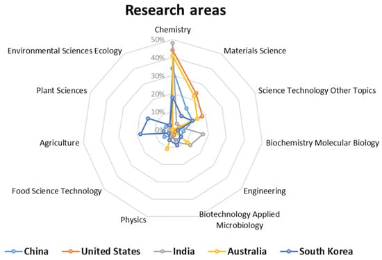 Different research methodologies applied to papers on MOFs reveal specific information on the processes, methods, and other aspects, highlighting the wide variability of research areas. The database documents identified 48 research areas, and 11 were considered the most relevant. Figure 9 shows the organization of the research areas in a radar chart, subdividing the relationships between quantity and countries with greater prominence. The chart shows that most countries tended toward research with a greater affinity for specific chemistry, with the United States, India, and Australia concentrating more than 40% of their production in this area. China had 34% of its publications in this research area and South Korea had 18%. An important feature of this graph is that China, the United States, and Australia had very similar research fields, and their quantitative representations had a similar format. In addition to “Chemistry”, these countries were associated with “Materials Science” and “Science, Engineering, and Others”. India and South Korea had a less concentrated distribution of their publications in other research fields. Furthermore, an article may be classified as research in two or more different fields of knowledge, and the proportion of documents in the research fields may proportionally exceed the number of documents in the database.