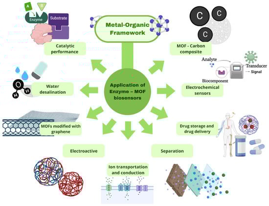 In this format, MOFs will develop a stabilizing microenvironment to provide protection to enzymes from denaturation and promote enzyme performance by performing the control of pore/surface properties (hydrophilicity, for example), which greatly enhances their application in various fields []. Most MOF compounds have naturally small electrical conductivity, limiting their application as electrical sensors []. Because of this factor, their applications in electrochemical sensing platforms have required developments both in conductivity and their composites and in strategies for interfacing these materials with electrode surfaces [].