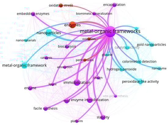 Figure 11 shows a more interactive representation of the data presented in Table 4. This figure shows distinct clusters of keywords separated by VOSViewer software. The purple cluster, which was the largest, contained keywords closely related to the enzyme MOF process. The blue cluster contained terms related to nanoparticle detection techniques such as glucose detection. Finally, the red cluster, which was the smallest, referred to studies directly related to enzymes, with MOFs less actively involved and present in some process examples. The size of each node in the figure corresponds to the number of occurrences of the keyword, while the size of the lines connecting the nodes represents the strength of the relationship between the terms.