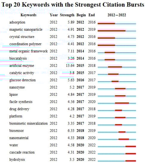 Figure 13 corresponds to the method used in Figure 12, where highlighted keywords and their research intensity in a certain time frame are shown. For example, the term “adsorption” had its peak occurrence in research from 2012 to 2016, while “magnetic nanoparticles” had a longer lifespan with good frequency in research from 2012 to 2019. This indicates that, compared with the former term, the latter term has attracted more interest from researchers to develop research related to it directly or indirectly. “Artificial enzyme” is a keyword that showed great relevance with a strength of 13.64 (the highest among the highlights) but had a shorter lifespan of only four years. This shows that this research topic had a lot of interest during this period, but was replaced by more attractive searches. The term related to glucose detection, which was cited a lot earlier in this paper, had the shortest lifespan of only two years due to the abundance of studies and results in this area. As a result, interest in scientific research has waned, leading to a migration to more attractive topics with fewer studies developed. An example of this is the lower part of the figure, where the term “water” is inserted into the use of MOFs to filter and purify water for human consumption.