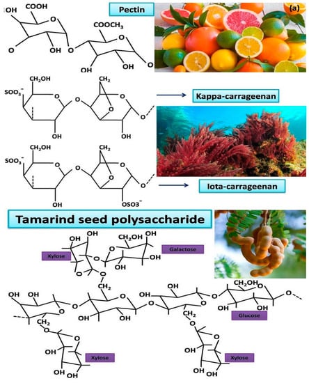 (a,b) Selected polysaccharide-based bio-matrixes and their extraction sources.