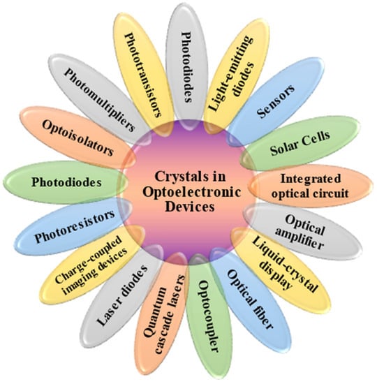 As organic and inorganic compounds possess diverse intramolecular interactions, these materials offer different optical as well as electrical and electronical characteristics. It is reported that a single crystal of an inorganic compound can be easily grown to a bulk size. It has high mechanical strength and a high degree of chemical inertness but shows relatively low NLO coefficients with respect to organic crystals. Conversely, organic crystals show large NLO coefficients, high sensitivity, low mechanical strength and are difficult to grow to a bulk size. Over the past few decades, researchers have taken efforts to combine the advantages of the inorganic and organic compounds and have developed a new class of material termed semi-organic crystals. The organic molecules linked by hydrogen bonds, π–π, or van der Waals intermolecular interactions give better optical performance when combined with inorganic salts. They offer better mechanical and electrical properties and are proven ideal for device manufacturing. This technically important class of crystals finds application in a variety of devices such as photodiodes, photovoltaics (or solar cells), photoresistors, light-emitting diodes (LEDs), encoder sensor integrated circuits (ICs), laser diodes, optical fibres, etc., as shown in Figure 1.