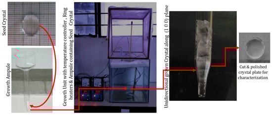The high-grade purity ADP and L-lysine were applied for growing crystals, employing repeated recrystallization. Deionized water was used as a solvent to grow seed crystals using the slow evaporation method. Based on the solubility information [28], 400 mL of a saturated solution of pure and 0.5 and 1 mol% of L-lysine admixed ADP was prepared, filtered, and the mixture was kept in beakers with a porously sealed cover; the solutions were made to evaporate under the identical circumstances. After nine days, tiny seed crystals were observed in a doped ADP solution and four days later in a pure ADP beaker. Crystals attained a suitable size in almost 20 days. The seed crystals up to size 20 × 5 × 15 mm3 were harvested. It was observed that the biggest size was attained by the 1 mole % L-lysine: ADP crystal. For growing bulk size unidirectional crystals by an SR method, good quality seed crystals having a size of 10 mm × 2 mm were chosen. The selected, unpolished seed crystals along the (1 0 0) direction were installed carefully at the base of the vessel [28]. The various growth vessels were carefully filled with the filtered respective solutions of ADP. All the growth ampoules were put in an ultra-clean room with a porously sealed top. For all the ampoules, applied temperatures were maintained at 37 °C at the top, and 33 °C at the bottom, with the help of the temperature controller; the whole setup is illustrated in Figure 2. For L-lysine-added ADP, crystal growth began after five days under ideal conditions, but it took nine days for the growth to begin in pure ADP.
