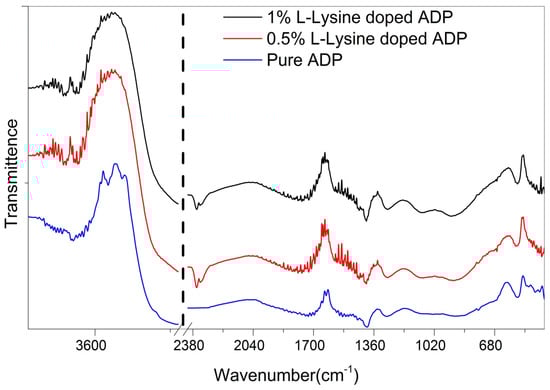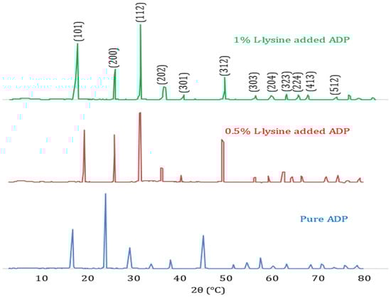 The diffraction pattern of pure ADP crystals depicts the perfect matching with JCPDS card number 89–7401, shown in Figure 3. The XRD pattern confirms the tetragonal structure for all the grown samples with space group I-42d. As in the diffraction spectra of the doped ADP, the crystal exhibits no additional peaks, indicating no record of any additional phase besides the tetragonal system. The crystallinity of the produced crystals is confirmed by the sharpness of the peaks. The development of isolated centres of NH4+ in the crystal lattice may be the cause of the improved crystallinity in the L-lysine-supplemented ADP; it hinders the production of bivalent ions’ chain structures [36].