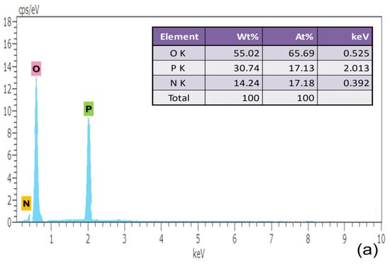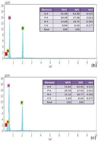 A micro-analytical method called energy dispersive X-ray analysis (EDAX) is utilized to learn more about the crystal’s precursor molecule. The sample is exposed to high-intensity electron radiation during an energy-dispersive X-ray examination to quantify the weight percentage of C, N, P and O, as presented in respective tables. The atomic number of elements contained has an impact on the energy of the radiation that results from it. The intensity and binding energy relation of the photoelectron that was released are recorded in the EDAX spectrum. It is noteworthy that the measurements of the number of constituents available in the sample are shown by peak height and peak area in Figure 4.