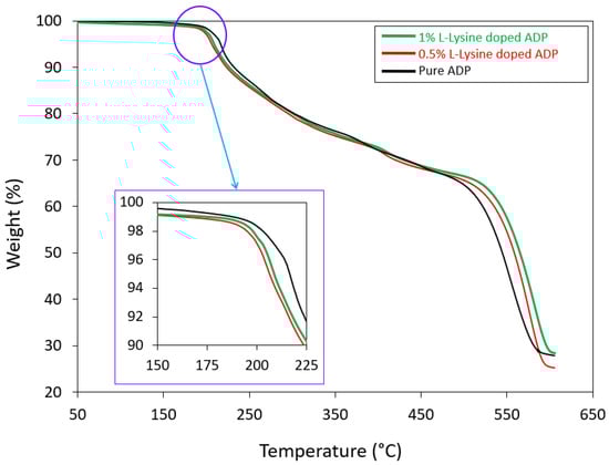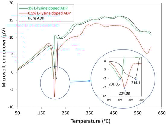 The DTA of all the grown crystals was performed at the temperature range between 28 °C and 600 °C. The DTA traces shown in Figure 7 indicate a strong endothermic peak between 201 °C and 204 °C for doped crystals, whereas for pure ADP crystal, it is at 214 °C. These peaks correspond to the melting of the crystals. Hence, the DTA curve reveals that the thermal stability of the L-lysine: ADP crystal is slightly hindered in comparison to the pure ADP crystal. It can also be concluded that with the increase in impurity concentration, the thermal stability of crystals decreases. The incorporation of the L-lysine molecule in the ADP crystal matrix may lead to an increase in bond order, which is inversely proportional to the bond length. In addition, the enhanced growth rate of doped crystals due to the fast absorption rate of impurity molecules may incorporate defects within. The inclusion of defects and a decrease in bond length leads to a decrease in thermal stability. A similar nature was noted for L-lysine-doped KDP [41] and L -LMHCl dihydrate-doped ADP [42].
