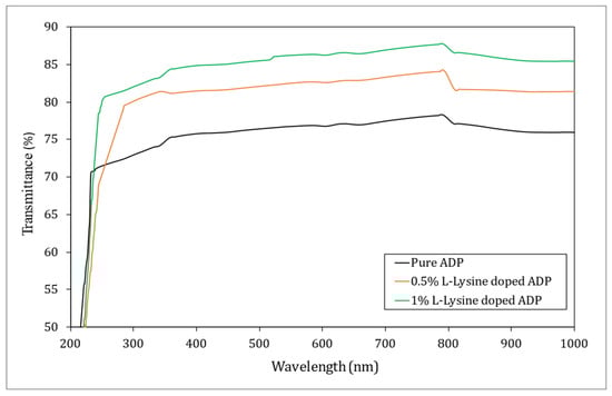 It was seen from the spectra that the produced ADP crystals displayed good transmittance over the wide window and hence found their application in UV-tuneable lasers and frequency conversion devices [43,44]. L-lysine has improved the optical quality of the ADP crystal, as is evident from the overlay UV–Vis–IR spectra, giving higher transmittance for 1% L-lysine: ADP crystal (~87%). This is due to the fact that in complexes involving metal and organic coordination, the organic legend dominates the NLO effects. The amino acids possess higher transmittance when added to ADP, resulting in an increase in transmittance. It may be due to the interaction between the O–H and C=O bonds [45]. Hence, it can be concluded that the organic L-lysine molecule increases the optical transparency of the ADP crystal, which is in good agreement with the results reported earlier [46,47,48]. Additionally, the purity of the starting materials and higher crystalline perfection play important roles in transmittance. The optical cut-off wavelength for pure and doped crystals ranges from 214 to 220 nm.