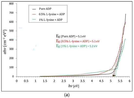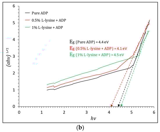 where T is transmittance, and t is the thickness of the crystal under test, which is equal to 2 mm in this case. The Tauc plot, shown in Figure 9a,b, gives the value of direct and indirect band gap energy. The direct Eg estimated from the Tauc curve is found to vary from 5.1 to 5.2 eV for grown crystals sufficient for optoelectronic devices, and the indirect band gap is found to be in the range of 4.1 eV to 4.4 eV; it is highest for 1% L-lysine-added ADP crystal, proving it to be suitable for optical devices [43,50].