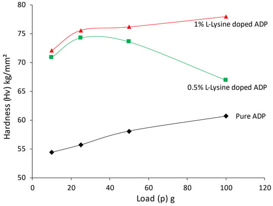 The hardness curve reflects that the L-lysine-added ADP crystal has increased hardness compared to the undoped ADP crystal. Hence, the addition of L-Lysine in ADP has provided mechanical strength to the lattice of the ADP crystal; the same results are reported in L -LMHCl dihydrate-doped ADP [42]. In the same way, it is noticed that with an increase in the doping percentage of L-lysine, the hardness of the crystal also increases. This can be correlated with the observations of the XRD study, which shows a decrease in the volume of the crystal lattice for the doping of L-lysine. The reduction in volume corresponds to minimum surface energy and hence a more stable lattice; as a result, crystals offer higher mechanical strength compared to pure ADP [51]. It is also noticed that up to 100 gm, no cracks have been observed in doped crystals.