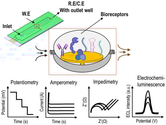 Illustration of electrochemical biosensor configuration on a microfluidic platform and various detection techniques.