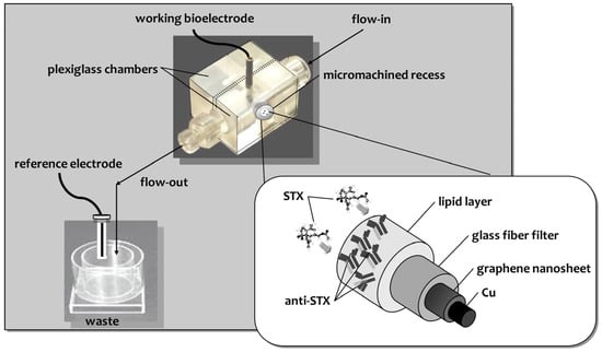 Schematic configuration of miniaturised potentiometric saxitoxin biosensor (adapted with permission from [] copyright 2023, John Wiley and Sons).