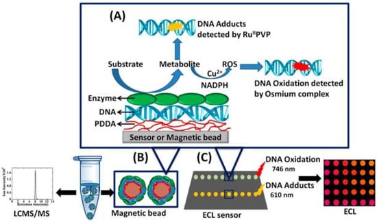 Four aryl amines, whose metabolites cause both DNA oxidation and nucleobase adduction, were used to test these novel arrays. The arrays showed the ability to detect both types of DNA damage and assess the impact of the bioactivation of these aryl amines by various human cytochrome P450s. Toxicology bioassays are important tools to complement in vitro screening assays that reveal potentially genotoxic chemistry pathways to forecast drug and pollutant toxicity. Microwell arrays containing reactant solutions in the presence of DNA/enzyme films at an applied potential generate metabolites. With the subsequent NADPH catalytic reaction, ROS are generated within the array environment via the activation of cyt P450s. As-generated reactive metabolites then form DNA adducts, which are detected through the RuPVP-based ECL system. Oxidative DNA damage from a Cu2+-metabolite-mediated redox pathway was detected by ECL using [Os(bpy)2(phen-benz-COOH)]2+. Calibration for the oxidation product 8-oxodG was validated using LC/MS/MS []. With the selective modification of sensor elements on a single electrode or an array of electrodes, one can personalise the specific detection of molecular toxicants such as ROS/RNS, even at the cellular level.
