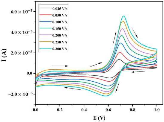 Here, Ip is the peak current, A is the area of the working electrode in cm2, C is the concentration in mmol/cm3, n is the number of electrons involved (n = 2) [31], ν is the scan rate in V/s, D0 is the diffusion constant in cm2/s, and α is the transfer coefficient. The calculated values using Equation (2) are presented in Table 2. These values are averaged to 2.19 × 10−5 cm2/s with the smallest value of 1.25 × 10−5 cm2/s and the largest value of 3.10 × 10−5 cm2/s at a scan rate of 0.025 and 0.300 V/s, respectively.