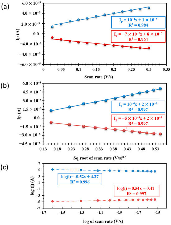The first criterion we need to know is whether the reaction is adsorption-controlled or diffusion-controlled because both processes require different forms of electrochemistry. Generally, Ip correlates with the scan rate raised to some power, which is supposedly b here. If the reaction is adsorption-controlled, the Ip vs. scan rate is linear (b = 1); if diffusion-controlled, the Ip vs. sq. root of the scan rate is linear (b = 0.5). We plotted Ip vs. the scan rate and Ip vs. the sq. root of the scan rate in Figure 2a,b, respectively. Comparatively, the best fit for Ip vs. the sq. root of the scan rate (Figure 2b) shows that the process is diffusion-controlled. However, R2 for Figure 2a is 0.984 and 0.964, and Figure 2b is 0.997 (for both lines), indicating a very small difference in the values of R2. We adapted an alternate approach to confirm the nature of processes in which the log of the scan rate vs. the log of the peak current is plotted. The slope of this plot shows the nature of the process: a slope near unity indicates adsorption-controlled, and near 0.5 indicates a diffusion-controlled reaction [32,34]. We plotted the log of a scan rate vs. the log of a peak current in Figure 2c. Figure 2c shows the slope close to ~0.5, which indicates that the reaction is diffusion-controlled. In the following sections, we calculated the transfer coefficient, diffusion coefficient, and electron transfer rate constant.
