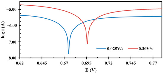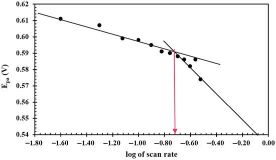 Here, all symbols have their usual meaning. Vc is the critical scan rate where the system undergoes a transition from a quasi-reversible to an irreversible system. Vc is determined using the plot of peak potential versus the log of the scan rate, as shown in Figure 5. Two straight trends were found at lower and higher scan rates with different slopes, and their intersection provided the value of Vc. Figure 5 shows that the log of the scan rate value is about −0.72, which corresponds to the 0.190 V/s scan rate (indicated by pink arrow). At the 0.190 V/s scan rate, Equation (8) produces the value of 0.017 cm/s.